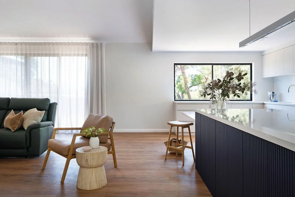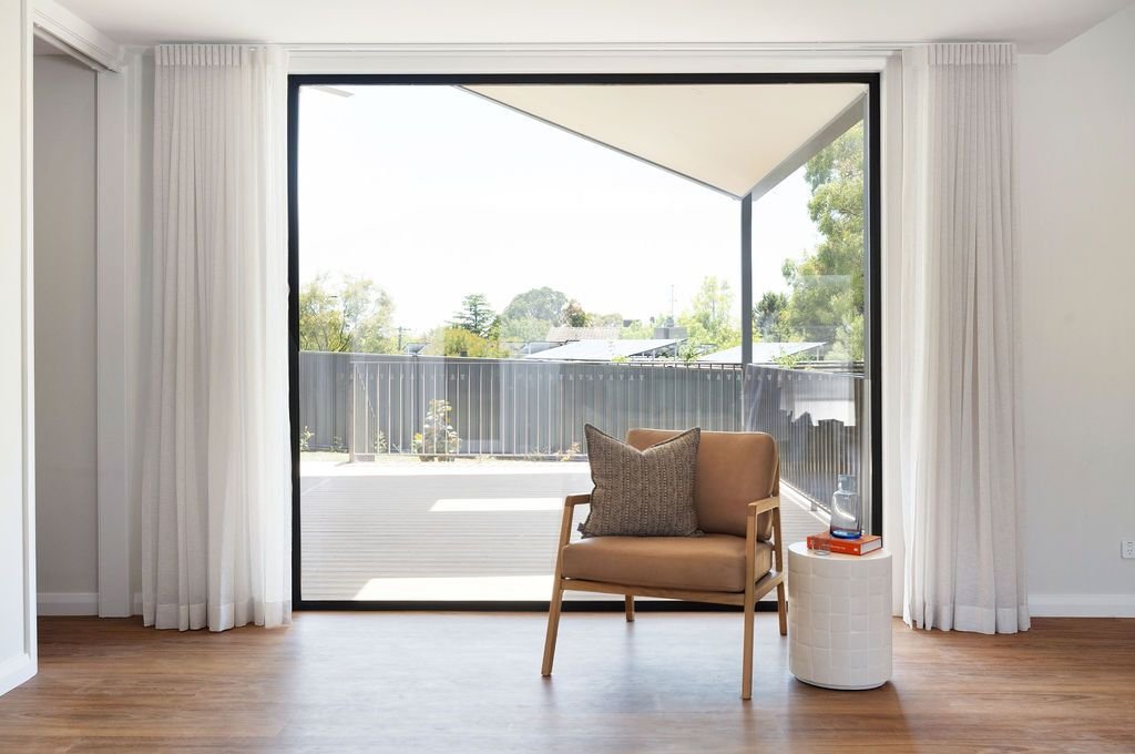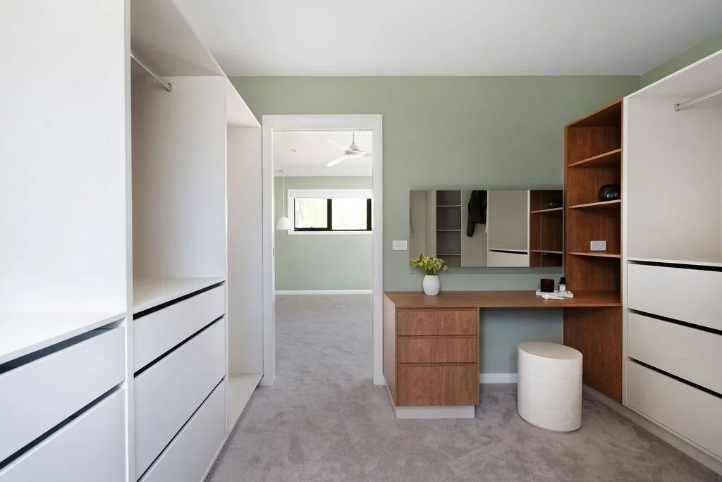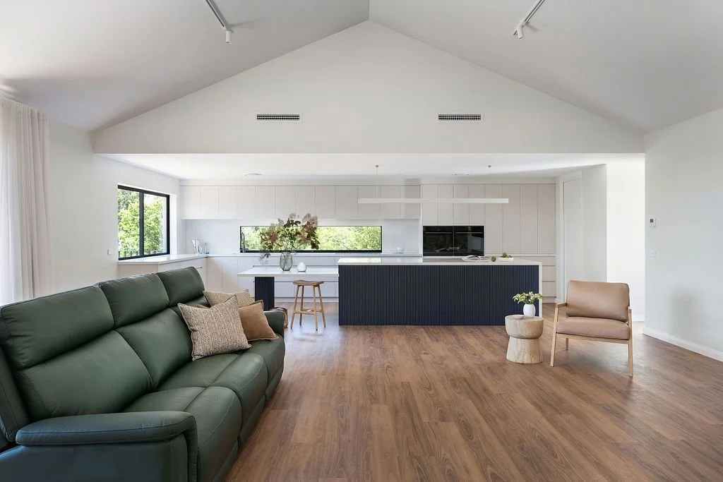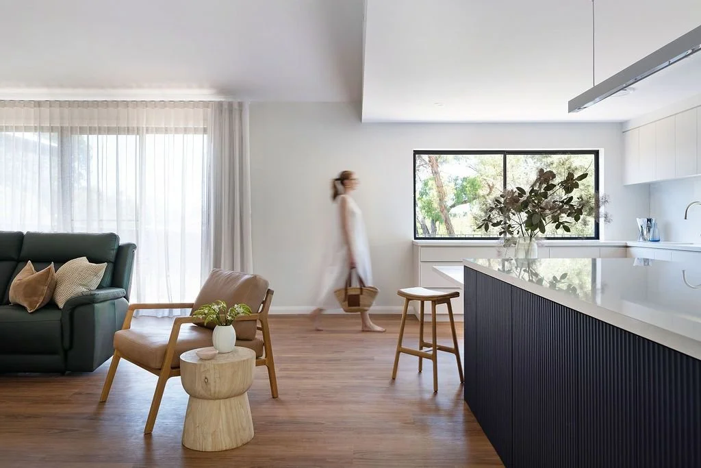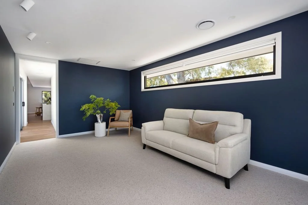 Timber flooring flows throughout the home, complemented by carefully crafted timber detailing within the walk in robe. Large windows have been positioned to maximise natural light and strengthen the connection between indoor and outdoor spaces.