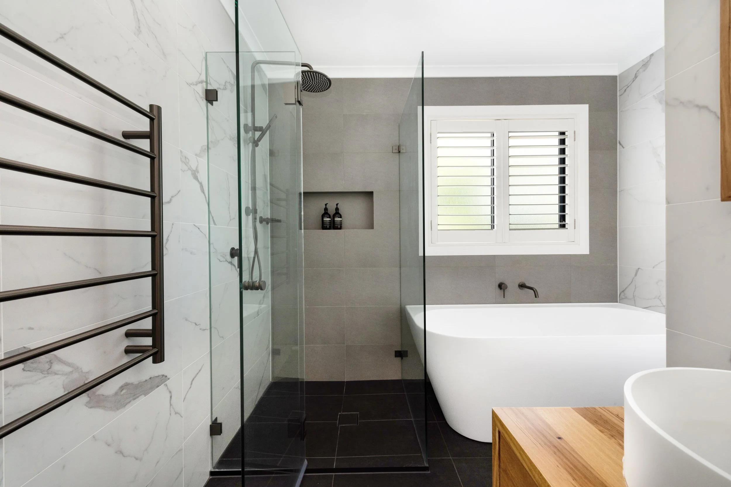 The main bathroom’s layout was kept, but it was modernised with up-to-date features to create a refined ambience. The space looks polished with a feature wall of grey tiles.