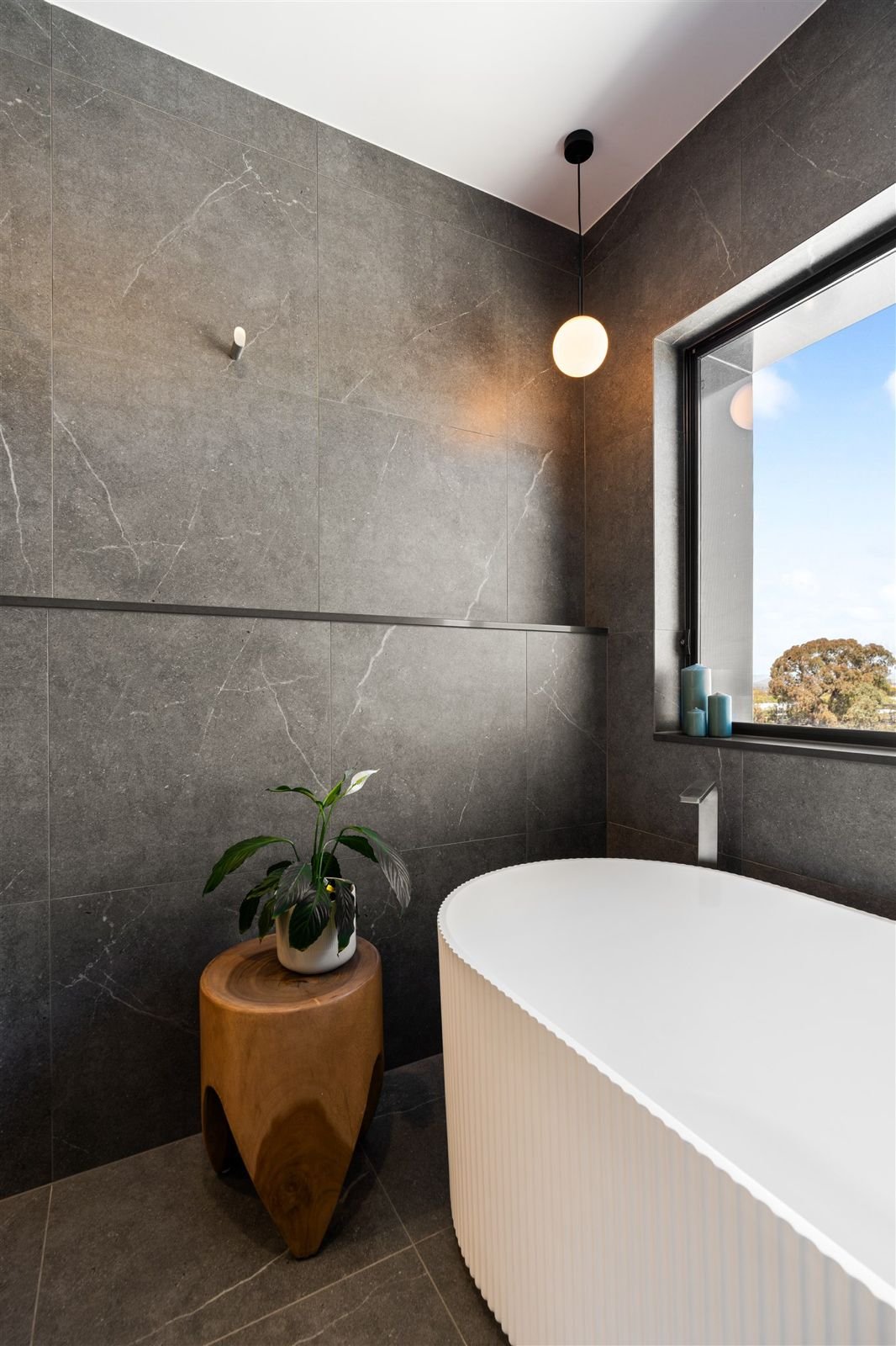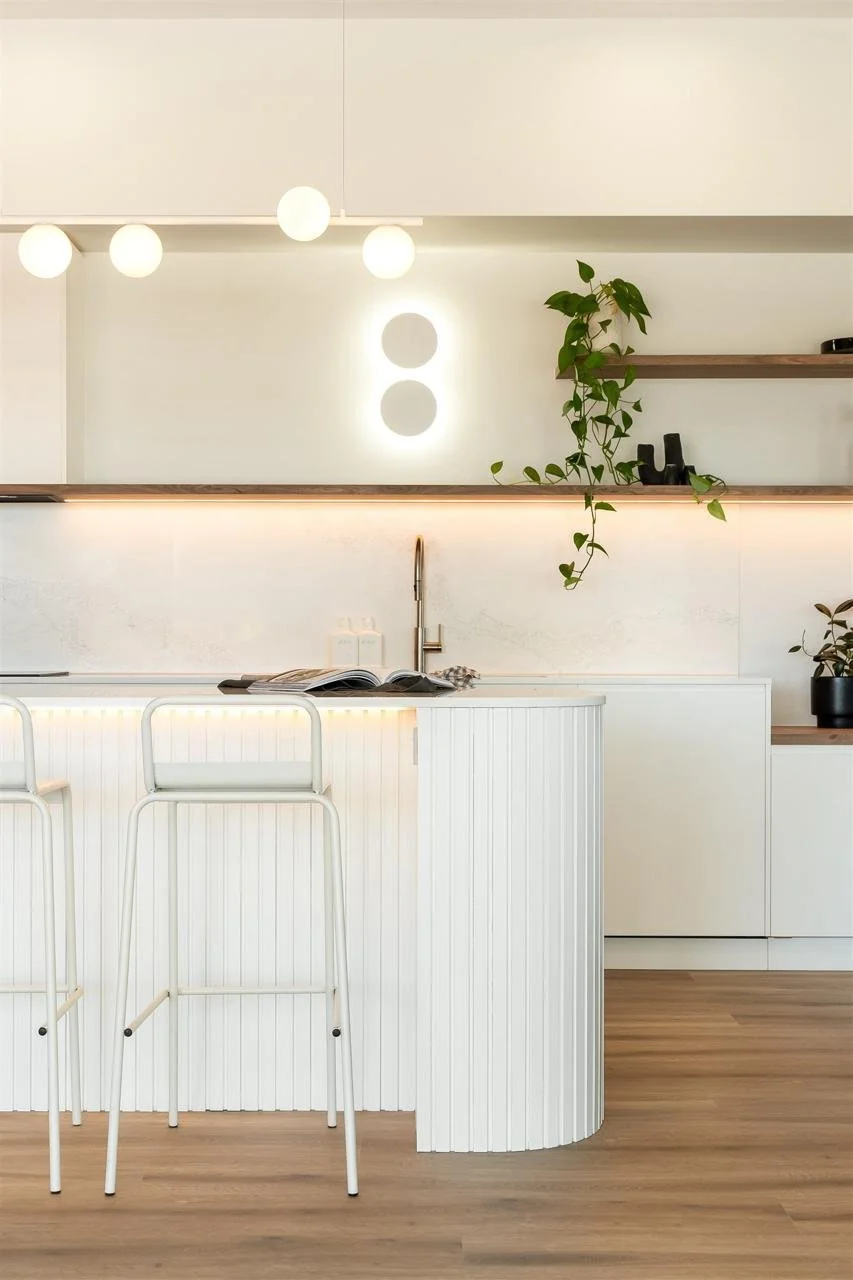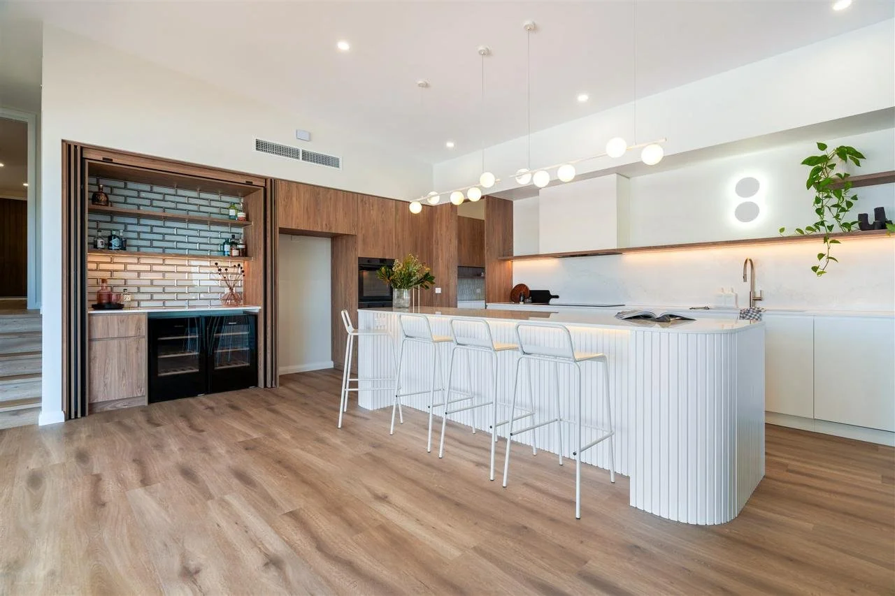 Inside, the home opens to a thoughtfully considered interior where craftsmanship and design work seamlessly together. At the heart of the home sits a beautifully designed kitchen, centred around a generous island bench with fluted detailing. Warm timber joinery balances crisp, minimalist finishes, creating a space that is both functional and visually refined.