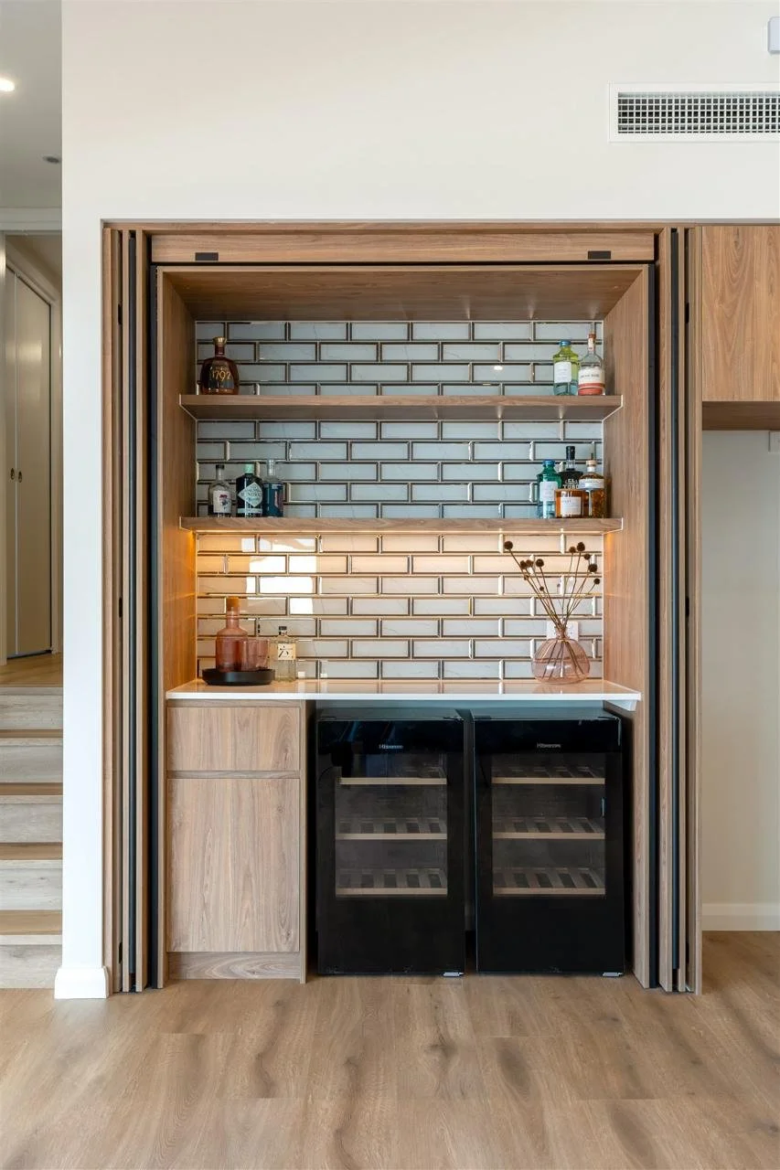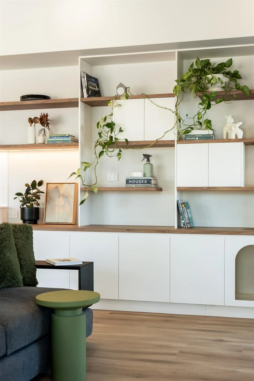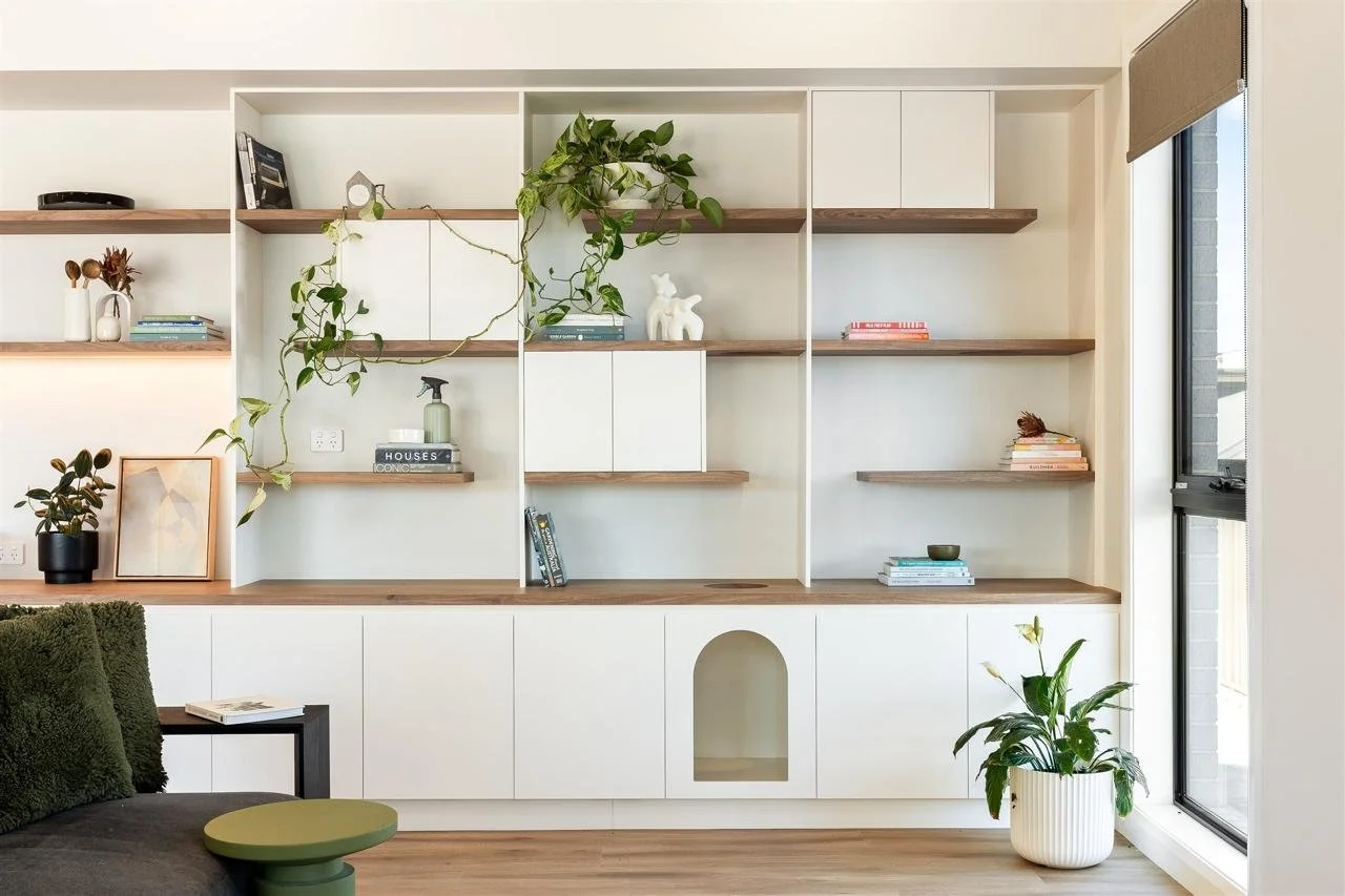 Custom joinery is a key feature throughout the home, carefully designed to enhance both practicality and aesthetic cohesion. Within the living space, a cleverly integrated cat run sits within the bookshelf joinery, blending effortlessly into the design while adding a unique and considered detail.