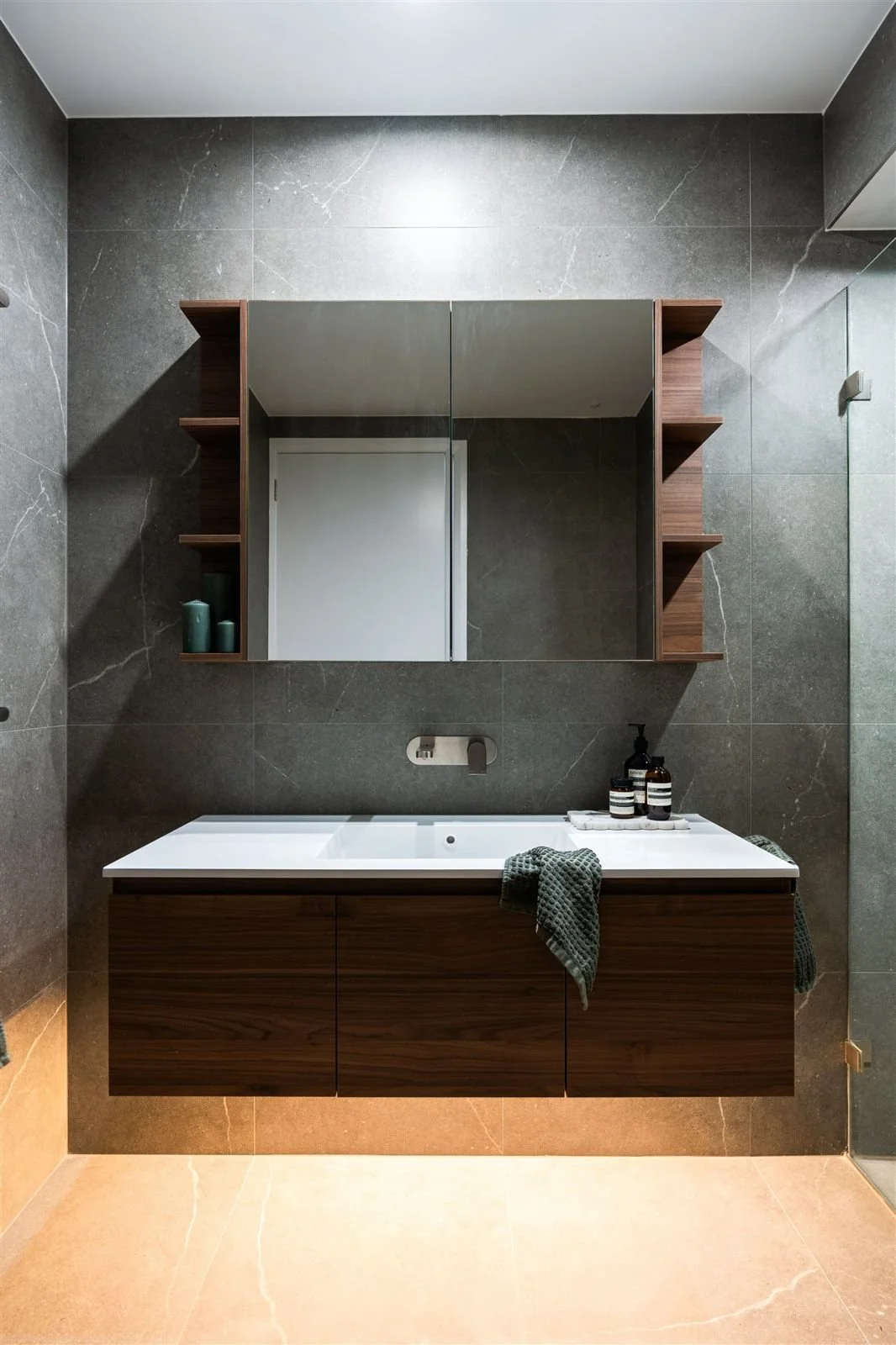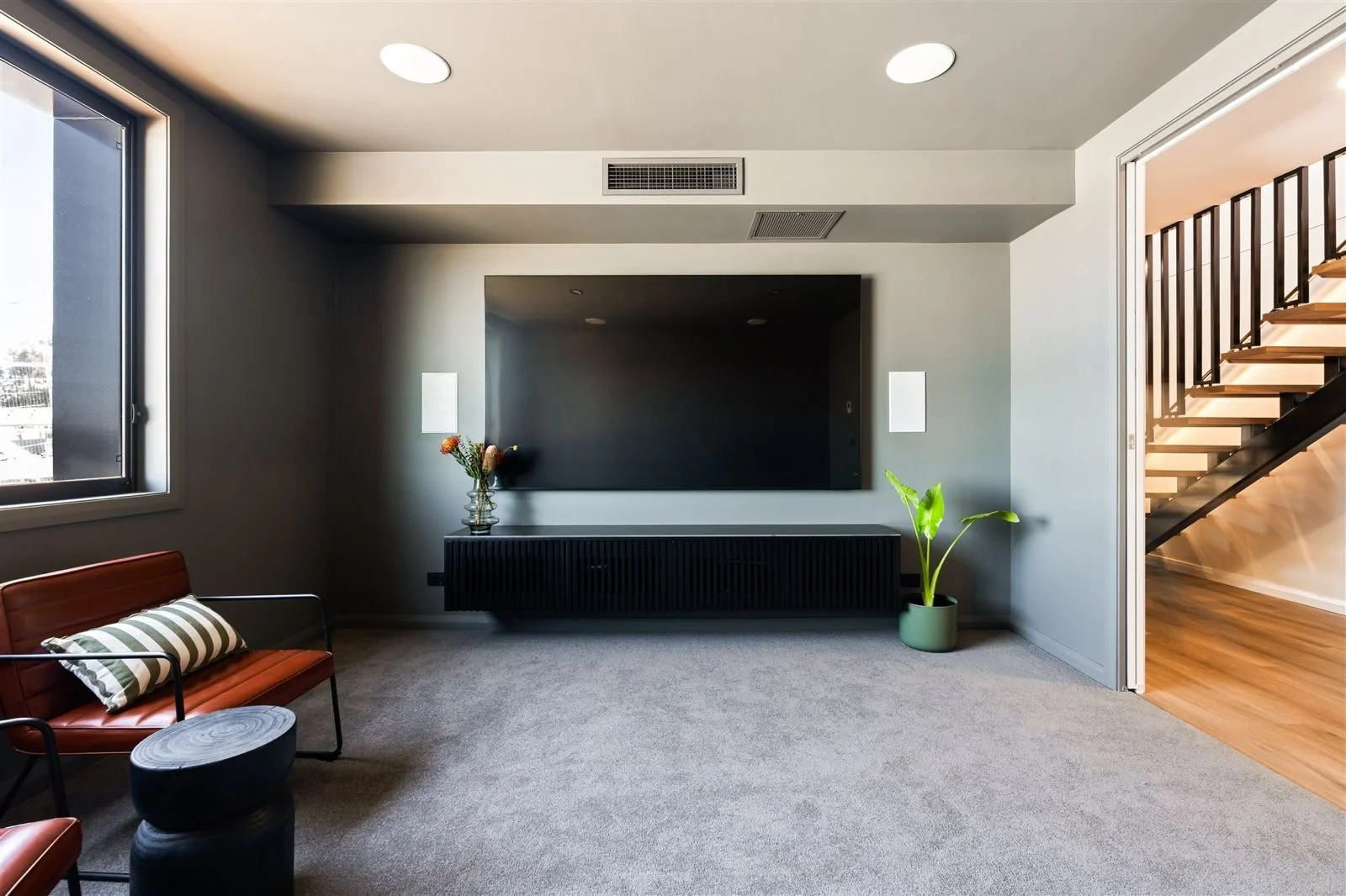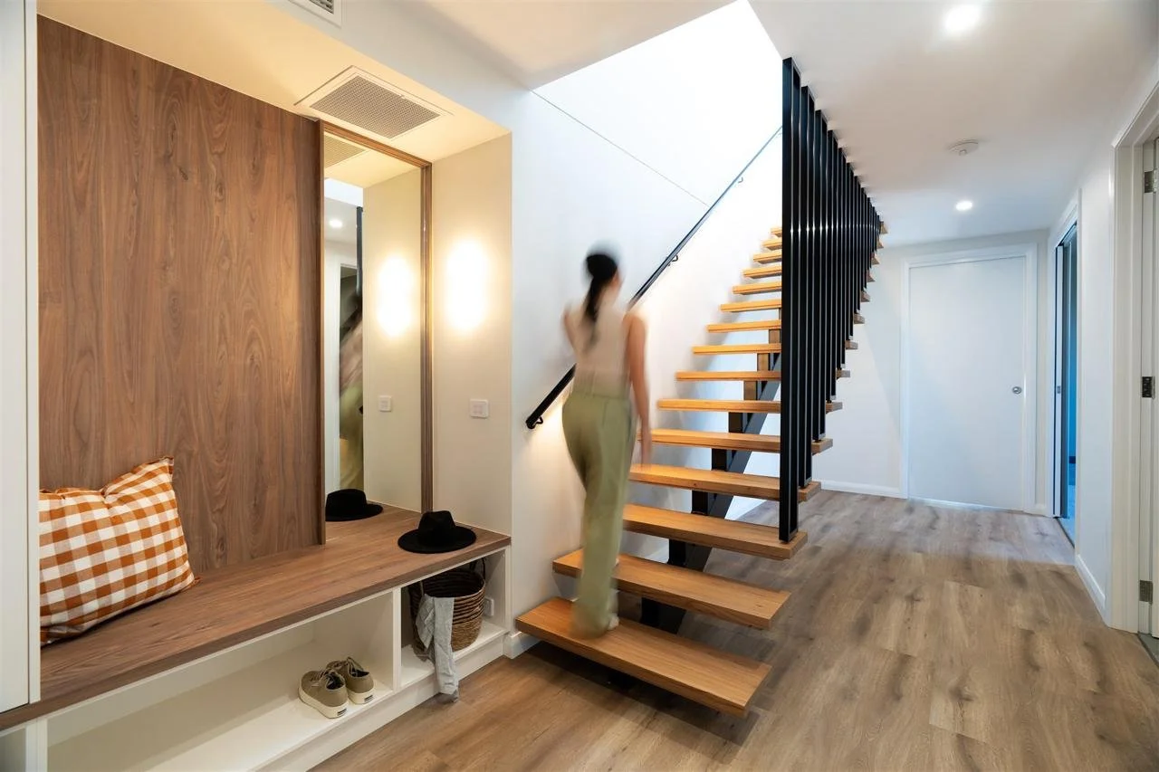 Custom joinery is a key feature throughout the home, carefully designed to enhance both practicality and aesthetic cohesion. Within the living space, a cleverly integrated cat run sits within the bookshelf joinery, blending effortlessly into the design while adding a unique and considered detail.